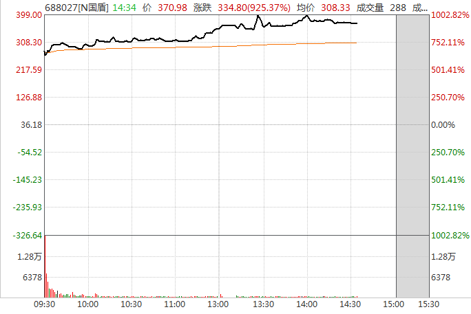 科创板上市新股国盾量子午后涨幅一度扩大至1000%,股价最高触及399元,最高单签获利181410元。由此打破科创板上市首日最大涨幅和中签收益两大纪录。目前公司股价报373元,单签获利168410元。