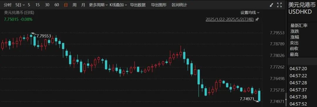 据香港《经济日报》报道,5月2日,在港元兑美元汇率一度升至7.75,触及香港金管局规定的联系汇率区间上限后,香港金管局自2020年以来首次通过干预买入美元。