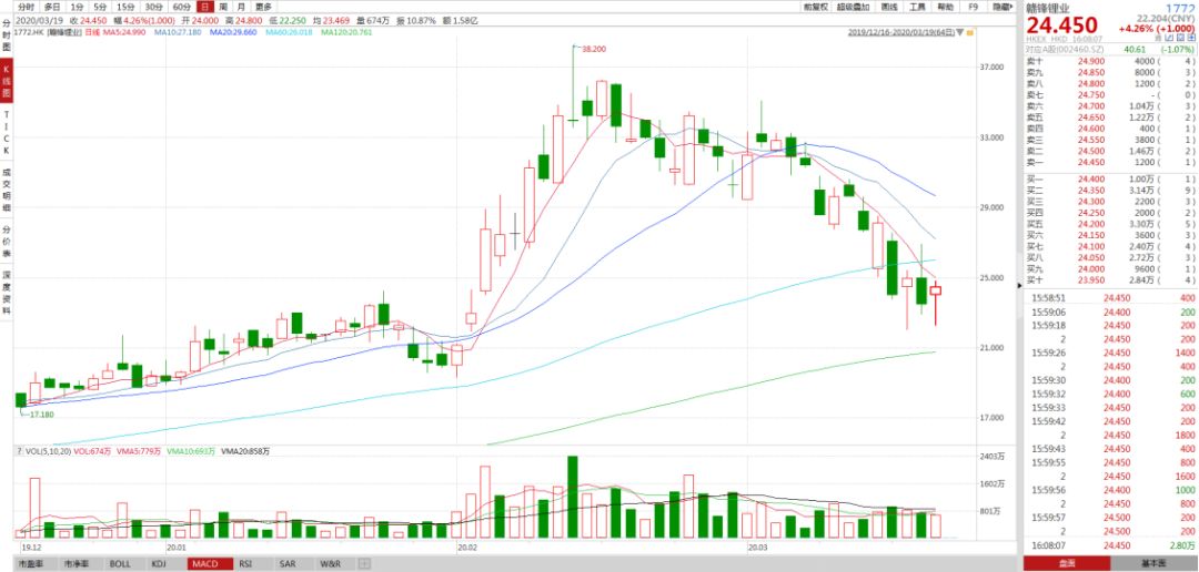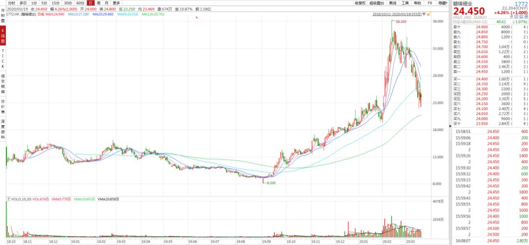 这期间赣锋锂业的股价一路下跌,从3月9日至3月16日6个交易日股价下跌了23.57%。