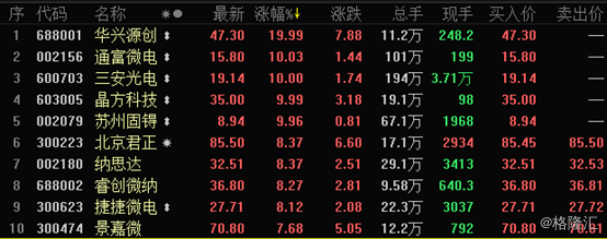 具体而言,半导体板块今日呈现批量涨停奇观。其中,华兴源创暴涨20%,通富微电、三安光电、晶方科技、苏州固锝强势涨停,北京君正、纳思达、睿创微纳均大涨超过8%。