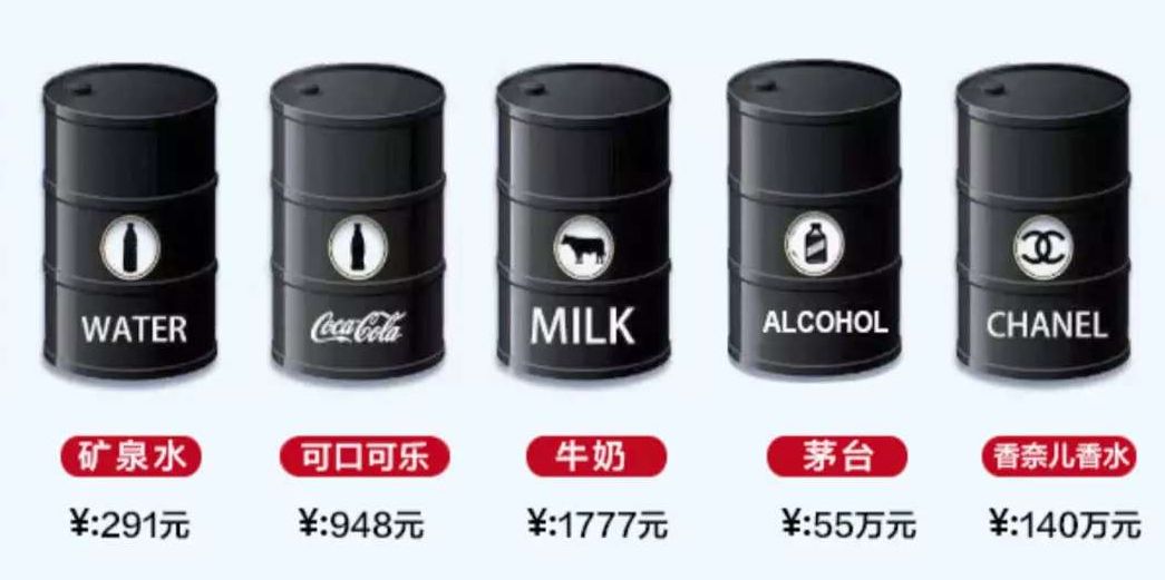 有人拿油价和水价做比较,发现一桶原油按20美元计折合人民币140元,同样容量的农夫山泉售价却接近300元。