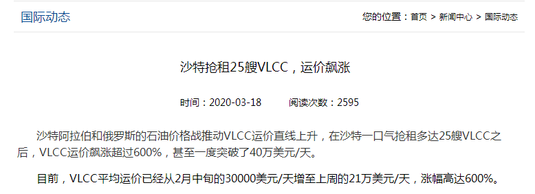 目前,VLCC平均运价已经从2月中旬的30000美元/天增至上周的21万美元/天,涨幅高达600%。
