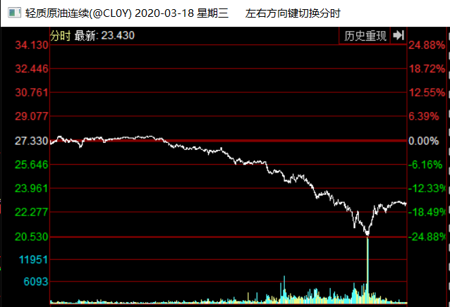 3月18日美股再次熔断之际,NYMEX原油期货主力合约(简称:美油)狂泻至18年来最低20.53美元。