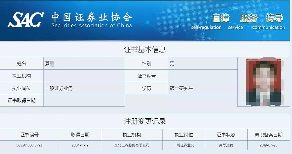 据公司内部人士介绍,綦某已在去年匆匆离职。而根据中证协注册证券从业人员信息查询来看,綦某的确在2019年7月办理了离职注销手续。