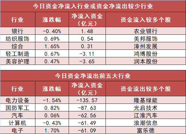 申万一级行业中,电力设备、国防军工、汽车、计算机等行业资金净流出规模居前,其中电力设备行业净流出135.57亿元居首。