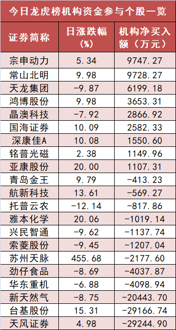 盘后龙虎榜数据显示,机构现身多股,其中宗申动力等股票呈现机构资金净买入,天风证券等股票呈现机构资金净卖出。