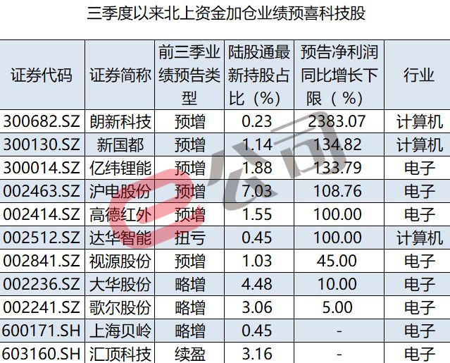 据e公司记者统计,三季报业绩预喜的科技股不少获“聪明资金”提前埋伏,北上资金与杠杆资金均加仓11股,其中新国都、亿纬锂能、达华智能获两者共同加仓。