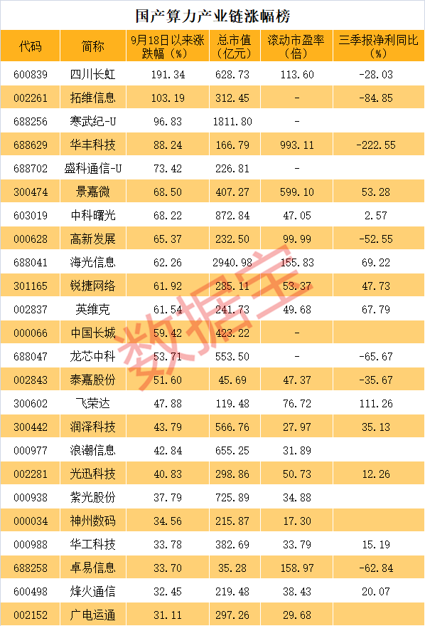 具体到个股来看,四川长虹9月18日以来累计大涨超191%,该股一方面有华为算力、华为海思等热门题材,同时还有重组预期。其次是拓维信息,累计涨幅也超100%,主要也是华为题材发酵。此外,寒武纪-U、华丰科技、盛科通信-U、景嘉微等均涨逾50%。