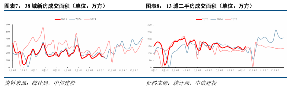 销售降幅有所扩大,一线城市相继出台政策。8月单月全国商品房销售面积同比下降10.6%,降幅较7月扩大2.8个百分点。8月至9月,北京、上海、深圳相继出台楼市新政,对限购、房贷利率等调控政策做出优化,对市场需求形成一定支撑。最新数据显示9月截至12日,38城新房成交面积同比增长2%,增速实现回正。