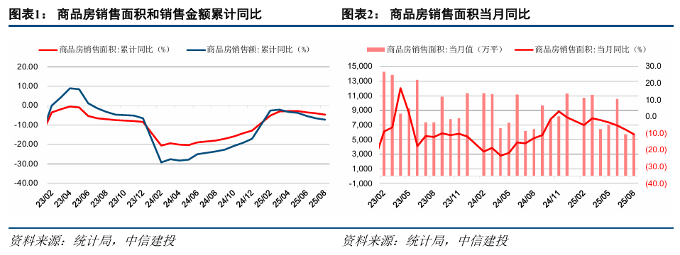 统计局公布2025年8月房地产市场运行情况,8月单月房地产销售面积、投资额、新开工面积、竣工面积分别为5744万平方米、6929亿元、4595万平方米、2660万平方米,同比增速分别为-10.6%、-19.5%、-20.3%、-21.4%,前值分别为-7.8%、-17.0%、-15.4%、-29.4%。
