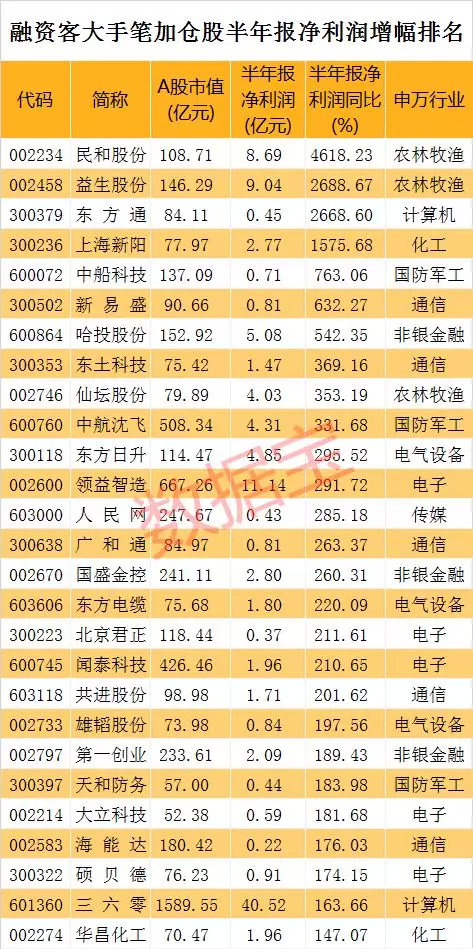 在融资客大手笔加仓的个股中,业绩依然是其考量的重要因素。数据显示,上述216股中有接近七成上半年净利润同比增长,其中38股上半年净利润实现翻倍增长。净利润增幅最高的是民和股份,公司上半年实现盈利8.69亿元,同比增长4618.23%。对于半年报业绩飙升,民和股份表示主要是鸡苗销售价格的上扬。
