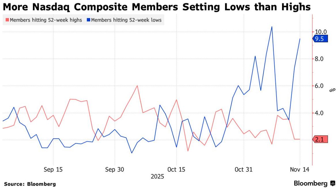 根据22V Research技术分析主管John Roque的说法,纳斯达克综合指数也发出了一些"丑陋"的信号。他表示,该指数约3300只成分股中,创52周新低的股票数量多于创52周新高的股票,这是市场内部疲软的迹象,使得进一步反弹的可能性降低。