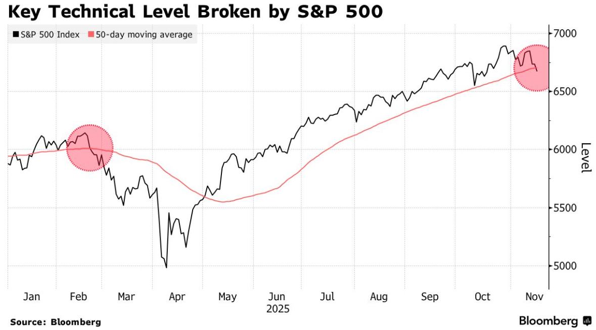 标普500指数周一的急剧抛售将其自10月28日最近一个纪录高点的跌幅扩大至3.2%,这是自今年2月至4月暴跌以来,该指数从历史高点出现的最严重回撤。这一基准指数收盘跌破50日移动平均线,为139个交易日以来首次,打破了本世纪维持在该重要趋势线上方的第二长纪录。