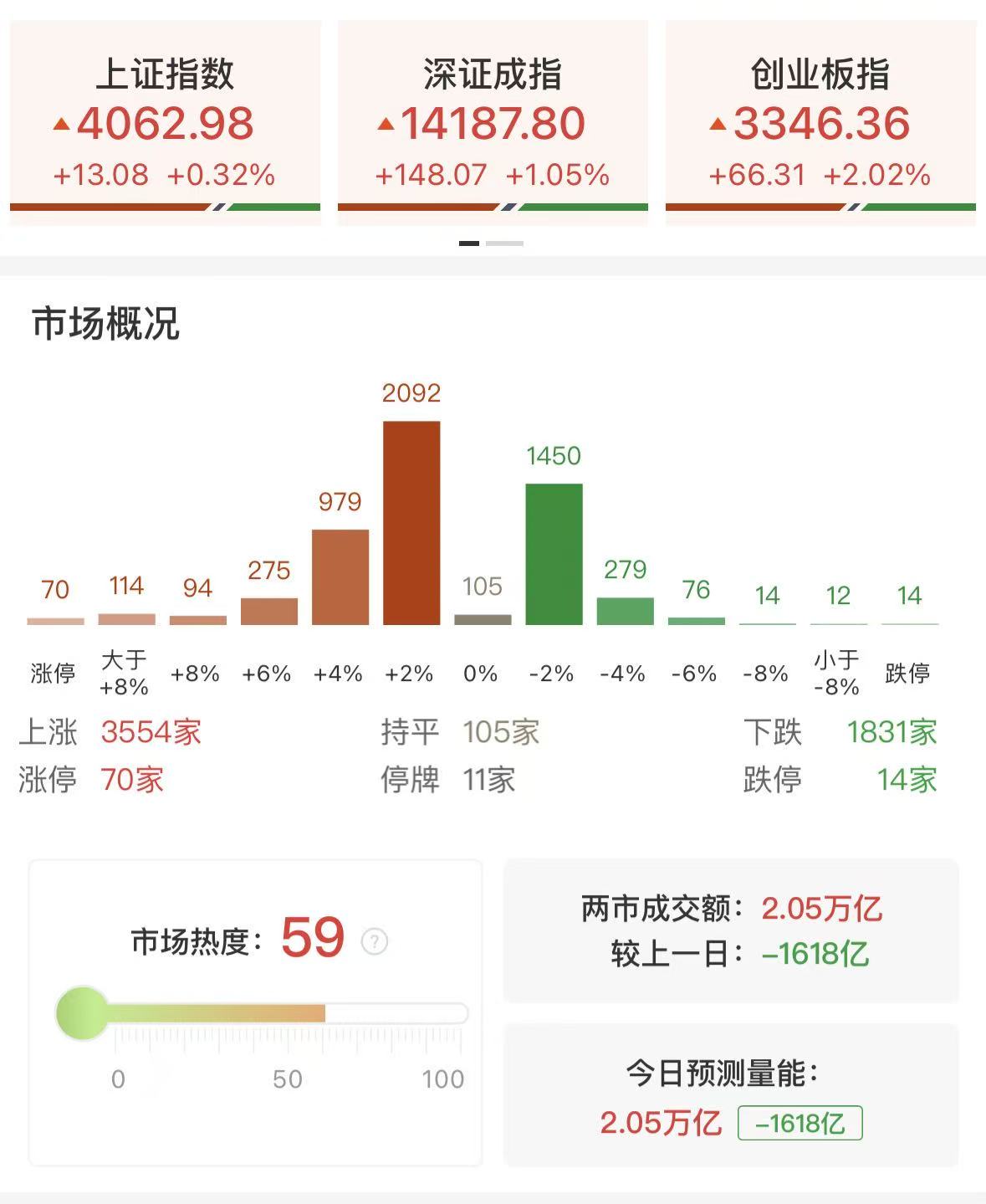 三大指数集体收红,沪指终结日线4连阴,深成指涨逾1%,创业板指涨超2%。沪深两市成交额2.05万亿,较上一个交易日缩量1618亿。盘面上,市场热点快速轮动,情绪出现回暖,全市场超3500只个股上涨。从板块来看,算力产业链爆发,其中CPO概念全线反弹,“易中天”光模块三巨头均大涨,瑞斯康达7天4板,可川科技3天2板。算力租赁概念走强,数据港、中贝通信、云赛智联涨停。算电协同概念表现活跃,韶能股份、粤电力A封一字涨停。存储芯片概念走高,朗科科技3天2板,佰维存储涨超9%续创历史新高。下跌方面,油气股走弱,洲际油气、通源石油等多股大跌。化工板块下挫,金牛化工、泸天化跌停。截至收盘,沪指涨0.32%,深成指涨1.05%,创业板指涨2.02%。