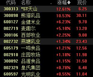 8月8日,乳业板块涨幅居前,截至发稿,*ST天山涨超12%,熊猫乳品涨超10%,金健米业涨超6%,麦趣尔、西部牧业、燕塘乳业、一鸣食品等不同程度上涨。