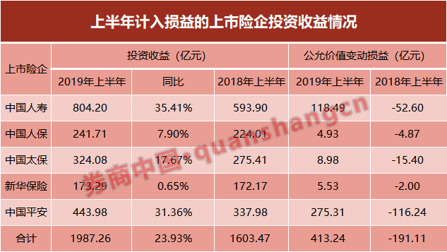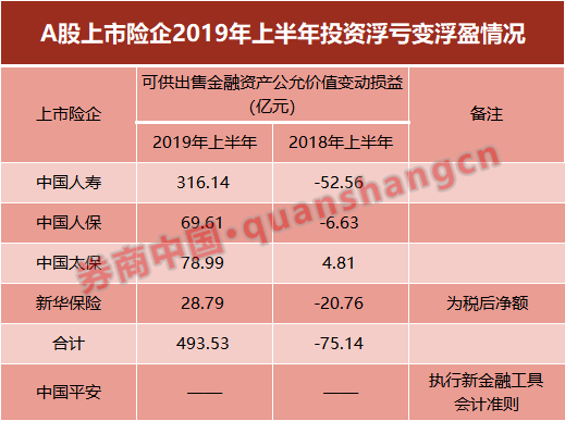 从可供出售金融资产公允价值变动损益看,中国人寿、中国人保、新华保险都由浮亏变为浮盈,中国太保则是浮盈金额大幅增长,这4家险企上半年合计浮盈494亿元,而去年同期为合计浮亏75亿元。