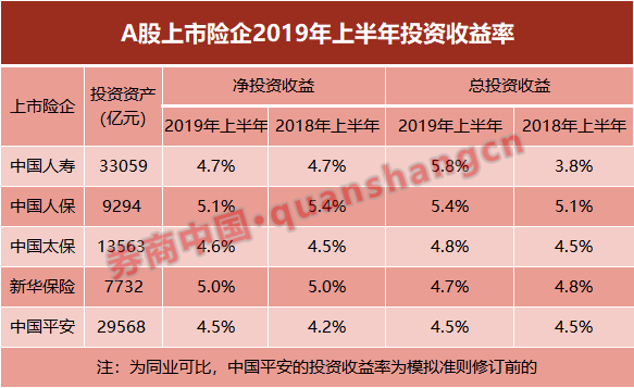 上市险企统一发布的投资收益率口径有2个,其中之一是净投资收益,包括各种利息收入、股权投资的股息和分红收入、租金收入等已经实现的收益,另一个是总投资收益,是净投资收益加上公允价值变动损益、证券买卖差价等。
