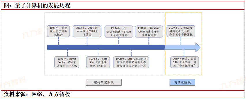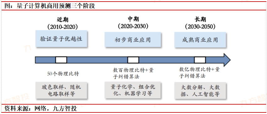 量子计算机商用预测三个阶段,当前第一阶段已经走完。在量子计算的原型机的开发这一水平上,谷歌提出的量子霸权是标志性事件。