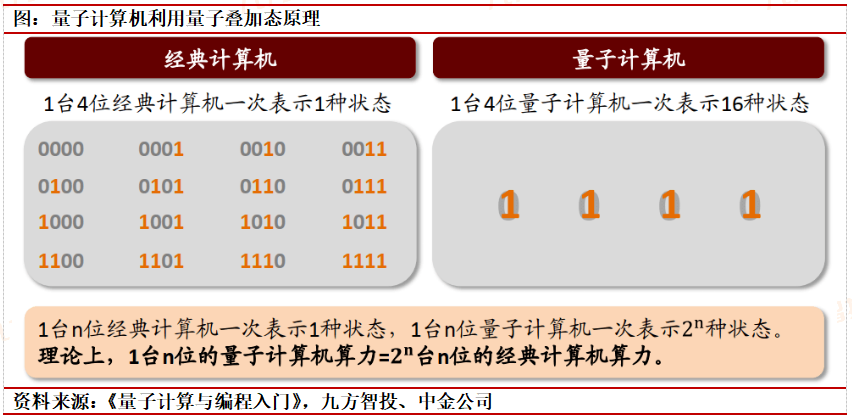量子计算跨越计算瓶颈,存储以及运算能力得到指数级的提升。在经典计算机中,用0和1二进制序列保存数据,01由不同的电压实现,0代表低电压信号,1代表高电压信号,每个电压信号只能表示一个数字,二进制序列由一个高低电压交错的脉冲实现,比如001对应于一个“低-低-高”电压的信号,N位二进制序列由于没有向量,某一时间只能保存一个值(比如四位序列1001=2^3+2^0=9),可以保存的数值种类为2的N次方个(比如四位二进制最多能表达0~15中的一个数值)。