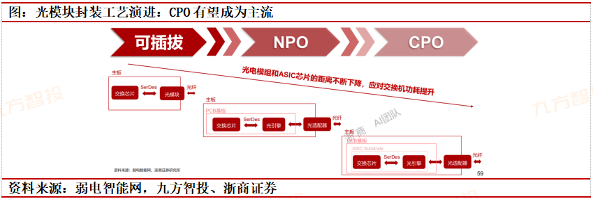 光模块封装工艺演进:CPO有望成为主流。CPO方案通过减少PCB布线长度的方式,可以显著降低高速信号的功耗。目前博通等厂商也已经推出相关CPO交换机产品,在全球科技巨头加大AI投入的背景下,相关方案有望加速渗透。AI产业化有望加速数据中心中光模块等需求增长与技术升级,相关产业将望长期显著受益。