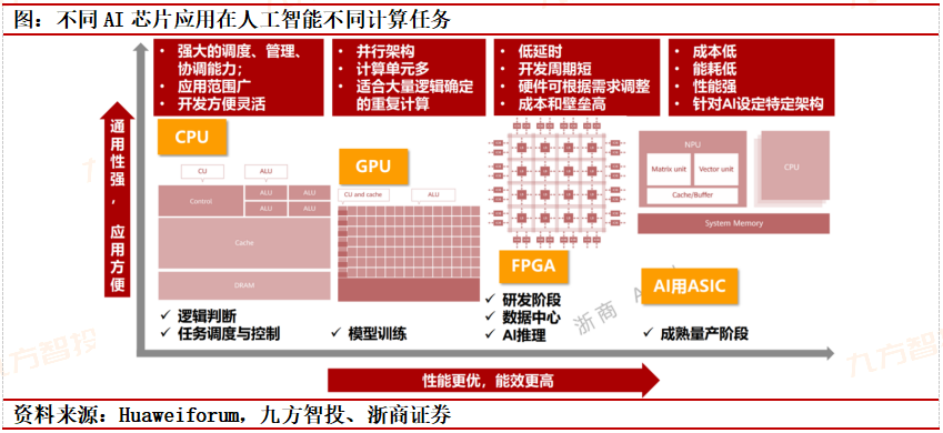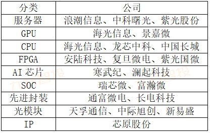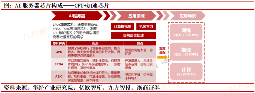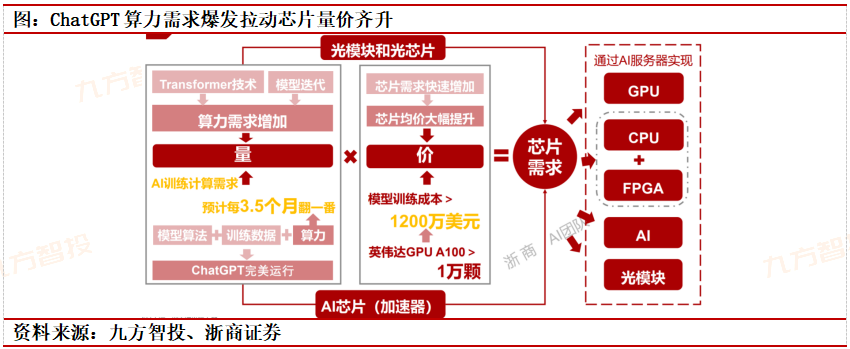 AI芯片专门用于处理人工智能应用中的大量计算任务的模块,包括GPU(图形处理器)、FPGA(现场可编程逻辑门阵列)、ASIC(专用集成电路)和DPU(处理器分散处理单元)等。ChatGPT的高算力需求对这些板块将产生实质性影响。此外,高算力芯片和高速内存相辅相成,内存接口芯片也有可能受到影响。AI算力需求不断升级,将对GPU、CPU、FPGA、AISoC等芯片的量与质提出更高要求。