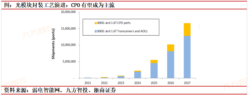 在最新的OCP峰会上,英伟达代表表示AI所需的网络连接带宽将增加32倍,当前光模块速率已无法满足这一带宽提升需求。继续使用光模块会带来成本翻倍和20-25%的额外功耗。为此需要新的激光器和调制器设计,并且CPO方案可能将功耗降低50%。预计CPO端口数量将从2023年的5万逐步增长到2027年的450万个。