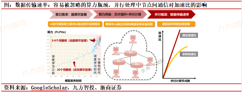 AI算力需求,性能不足,数量来凑。AI算力需求指数型增长,芯片性能进步远远无法满足。数据显示,从2012年到2018年,训练AI所耗费的算力增长了30万倍,而摩尔定律在相同时间只有7倍的增长。因此,AI训练模型算力需求增长与芯片计算性能增长之间的不匹配,或将带来对算力基础设施供给需求的快速增长。