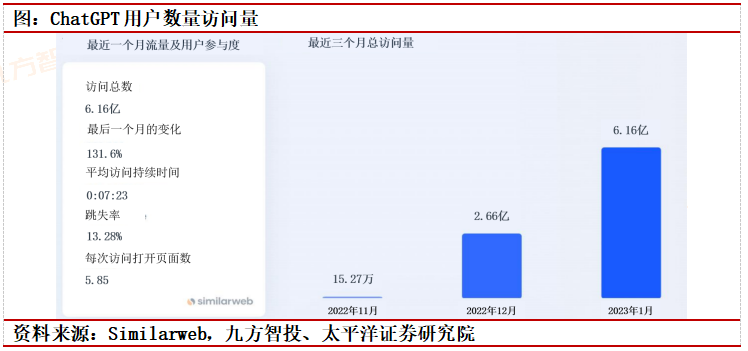 根据Similarweb数据,网站chat.openai.com在最近3个月以来用户数量快速增长。2023年1月,网站访问量达到61600万人次,相比2022年12月访问量26600万人次增长131.6%,相比2022年1月访问量15.27万人次增长174018%。