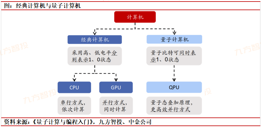 量子计算:以量子比特为基本单元,利用量子叠加、纠缠和干涉等原理,进行高速的数学和逻辑运算、存储及处理量子信息。