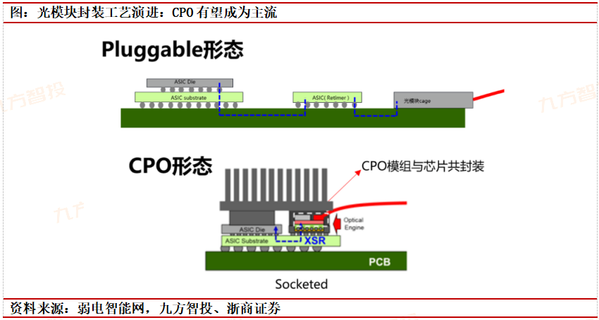 高算力场景下,交换机/光模块等设备和器件,基于功耗和成本等考虑,可能会发生结构性的变化。通过新技术、CPO(光电共封装)、硅光、耦合、液冷散热等共同达到高算力但非高功耗的目标。