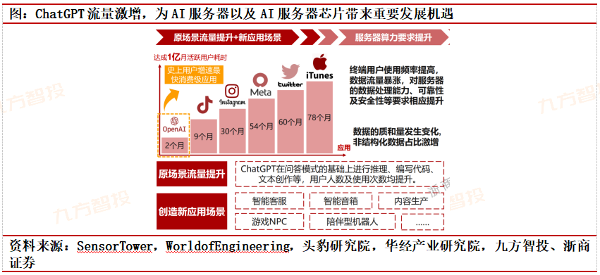 ChatGPT用户数快速增长,需求量火爆引发宕机。ChatGPT自发布以来用户数量快速增长。在庞大用户群涌入的情况下,ChatGPT服务器2天宕机5次,火爆程度引人注目的同时也催生了对算力基础设施建设更高的要求。