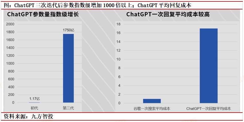 ChatGPT用户数快速增长,需求量火爆引发宕机。ChatGPT迭代后参数指数级增加1000倍以上,平均回复成本是谷歌搜索6-28倍。经历3次迭代,参数量从1.17亿增加到1750亿,训练量指数级大幅提升。ChatGPT一次回复成本大约是谷歌搜索查询平均成本的6倍-28倍。