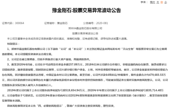 截至2020年6月底,豫金刚石在手可动用货币资金余额257.09万元,2018年以来该公司部分合作银行、非银金融机构存在断贷、抽贷或要求公司提前还款,融资渠道受阻。同时因诉讼事项,该公司大部分银行账户资金、土地、对外投资股权等被冻结、查封,该公司资金链紧张和持续经营能力存在风险。
