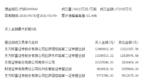 同样的情况也在豫金刚石身上重演。深交所的数据显示,在9月30日至10月9日两个交易日,买入豫金刚石的前5大营业部有3个来自有“散户大本营”之称的东方财富拉萨团结路相关营业部。