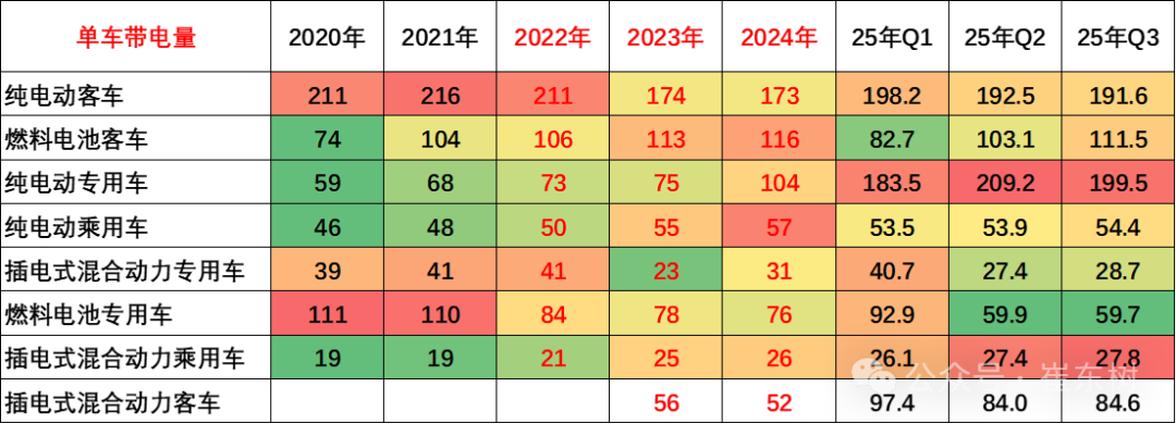2025年3季度的电池能量密度160以上的车型占比7%,相对于2024年的11%出现了明显的下降,这主要还是磷酸铁锂电池对三元替代带来的能量密度下降。而125以下的能量密度的产品2025年下降到了1%的比例。