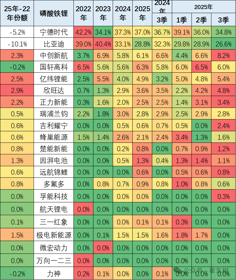 磷酸铁锂电池的产品差异优势明显。比亚迪相对优秀,但今年年初处于调整期。宁德时代的磷酸铁锂电池的占比份额从2024年已经反超比亚迪。2025年比亚迪持续下行,份额较同期下降10.1个百分点。亿纬锂能和中创新航表现较强。欣旺达、瑞浦兰钧、蜂巢能源、极电新能源的提升明显。
