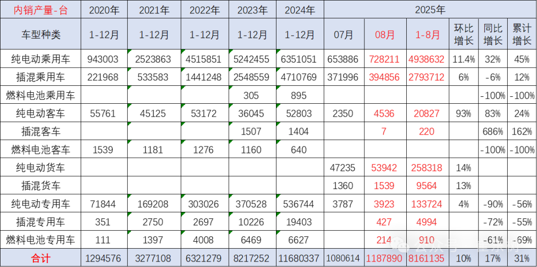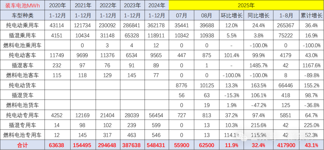 2025年8月的电池装车增长达到32.4%,其中商用车增长较强,尤其是8月的纯电动货车猛涨164%,而插混货车增长106%。