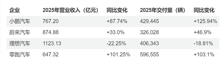 小鹏和零跑是2025年营收增长最快的两家企业,同比增幅分别达到87.74%和101.25%,但盈利能力出现分化。