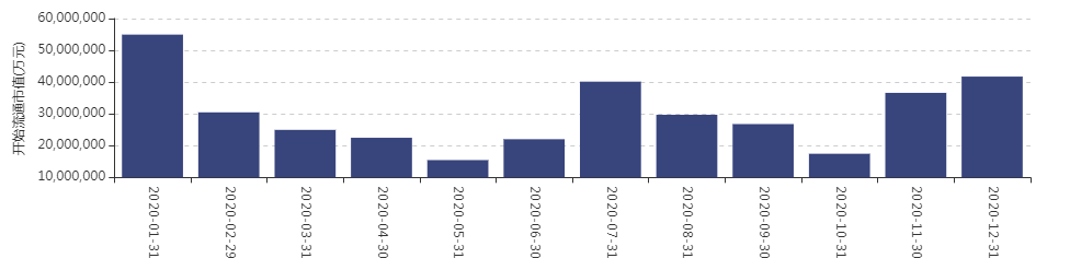 Wind数据显示,2020年全年共有1605家上市公司涉及限售股解禁,相比上年同期的2163家,下降了25.8%。涉及限售股股数合计2738.46亿股,与上年的2703.46亿股相比,同比增长了1.29%。流通市值合计3.63万亿元,相比上年同期的3.3万亿元,同比增长了10%。A股解禁压力相比2019年,整体有所上升。按月份看4、5、6月份将迎来限售股解禁低谷期,其中,5月份为全年最小解禁月。