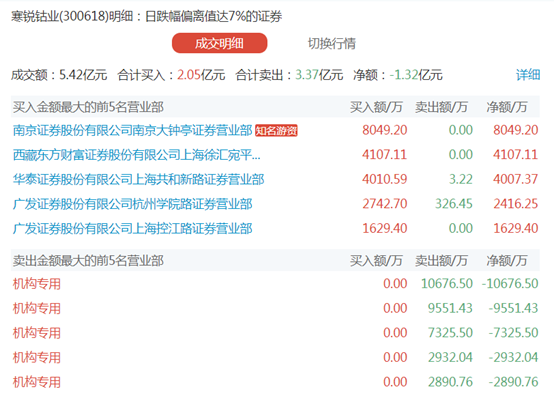 寒锐钴业今日卖出净额为1.32亿元,合计卖出3.37亿。值得一提的是,机构清一色卖出,卖出前五合计净卖出3.34亿元,买一则是知名游资所在的南京证券南京大钟亭证券营业部,净买入8049万元。