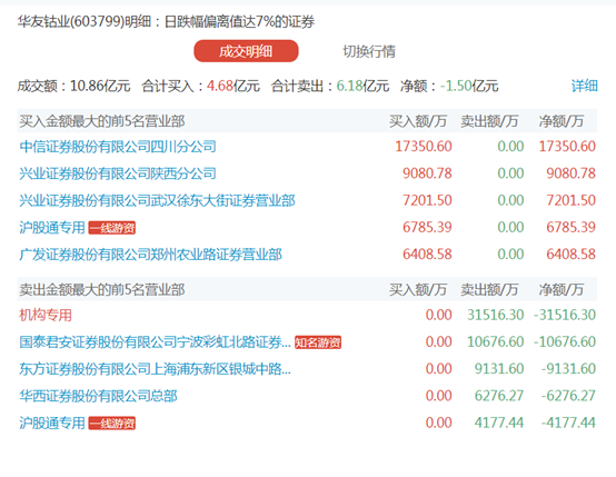 华友钴业龙虎榜上,今日合计卖出6.18亿元,卖出净额1.5亿元。机构净卖出3.15亿元。游资处于博弈状态,买三净买入6785.39亿,卖二和卖五合计净卖出1.49亿元。