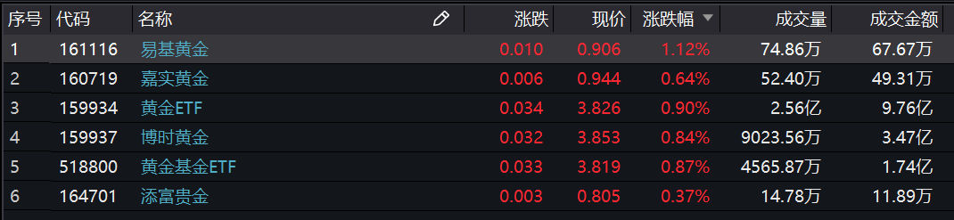 除此之外,黄金板块同样表现强势,场内相关主题基金悉数飘红,易基黄金(161116.SZ)涨幅超过1%,嘉实黄金(160719.SZ;160719.OF)、黄金ETF(159934.SZ)涨幅近1%。