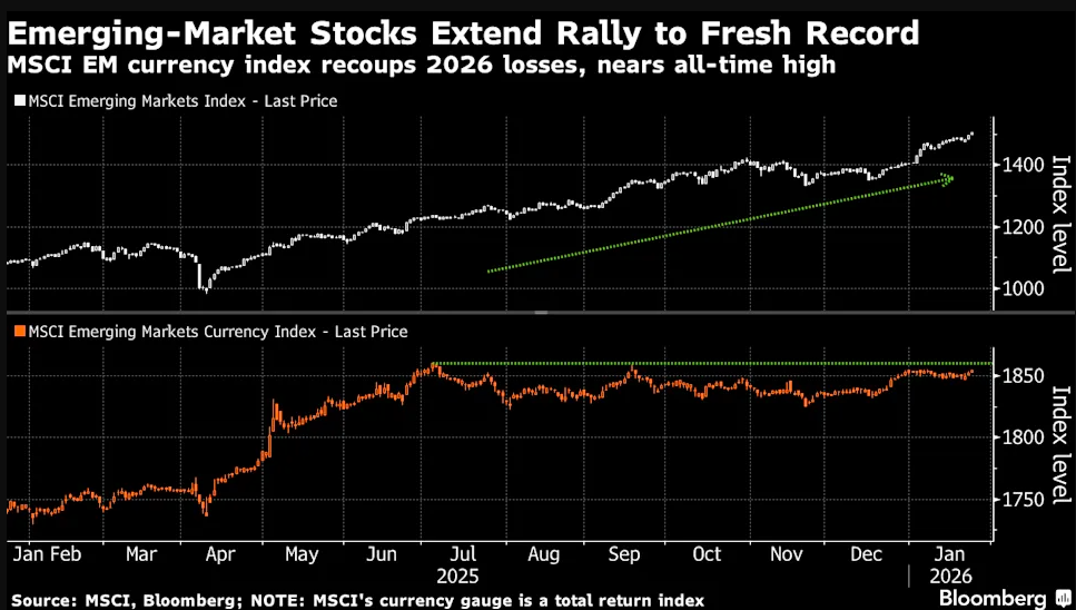 即便格陵兰岛争端目前有所缓和,但该事件仍重新引发了对美国例外主义和美元角色的质疑,促使从欧洲到印度的基金纷纷分散投资于美国国债之外。这种资金流动为新兴市场涨势增添了动力,而这种涨势本身已受到强劲的全球增长、AI支出热潮、拉丁美洲的政治转变,以及广大发展中国家正统财政和货币政策的推动。