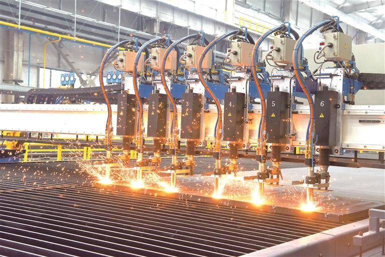 洁净明亮的车间内,“麒麟臂”快速运转,稳稳将几十吨重的结构件产品腾挪到位。在上百台机器人的辅助下,切割、焊接、翻转、搬运、组装等工序一气呵成,23条智能化生产线仅需几名巡检工人……