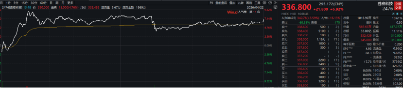 4月21日,港股上市首日,胜宏科技大幅上涨50%,收报315港元/股,总市值约3050亿港元;4月22日,胜宏科技继续保持涨势,全日大涨6.92%,收报336.8港元/股,2天大涨超60%,总市值达3736亿港元。