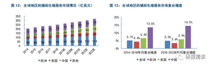 2018-2023年,全球辅助生殖市场有望由248亿美元增加到317亿美元,复合增长率为5.0%,中国市场规模有望由38亿美元增长到75亿美元,复合增长率达14.5%,中国地区的市场渗透速度继续提高。