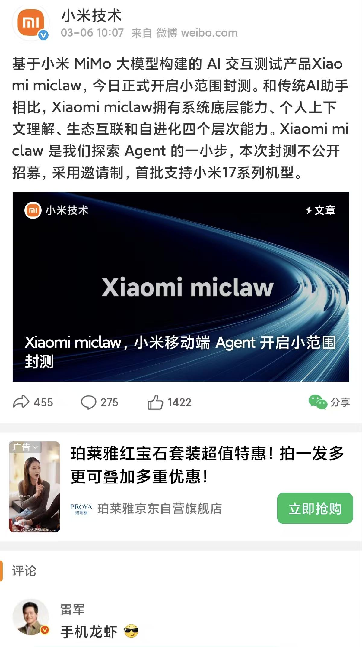 今日,小米技术官方微博发布博文称,基于基于小米MiMo大模型构建的AI交互测试产品Xiaomi miclaw开启小范围封测。雷军亲自下场点评,留下四个字:“手机龙虾。”