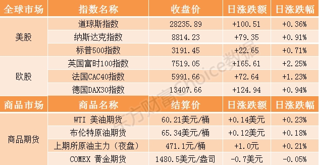 隔夜外盘:欧股大涨 美股三大股指四连涨再创收盘新高