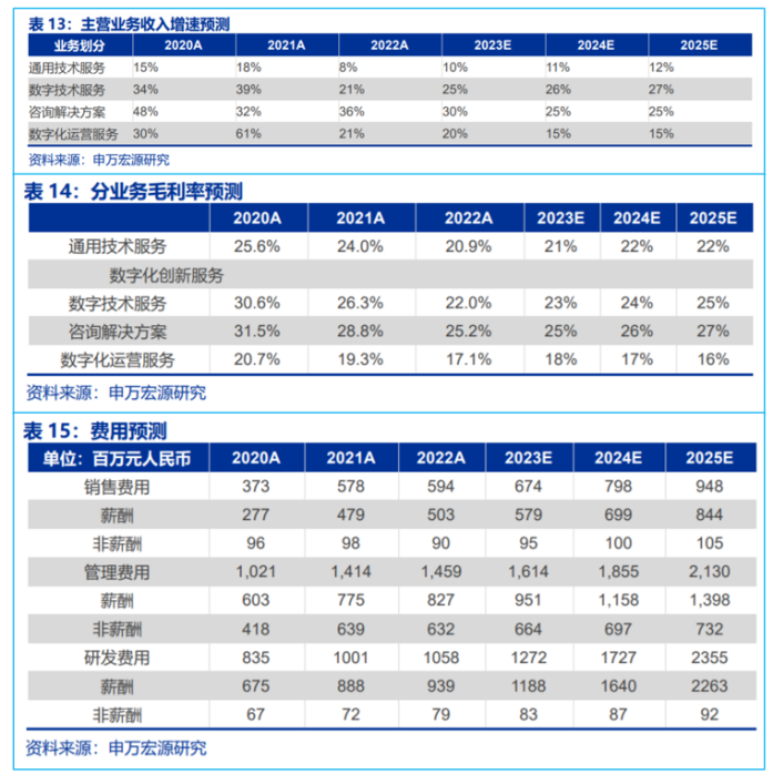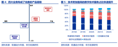 软通业务重心向产品化的数字技术服务调整。2022年,软通动力数字技术服务收入占比达38%,且公司发布股权激励,考核要求为数字化创新业务(数字技术服务+咨询与解决方案)23-25年收入增速分别为24%、25.8%、26.9%。按照该指引,数字技术服务收入占比将进一步提升,带动公司业务结构继续产品化。