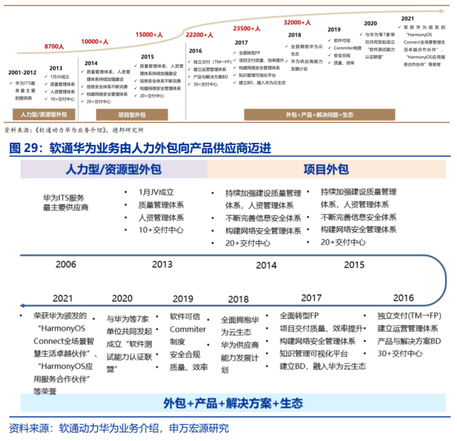 人力型/资源型外包阶段(2001-2013年):该阶段软通动力是华为ITS服务最主要的供应商,2013年软通动力与华为成立合资子公司并为华为建立质量、人资管理体系;